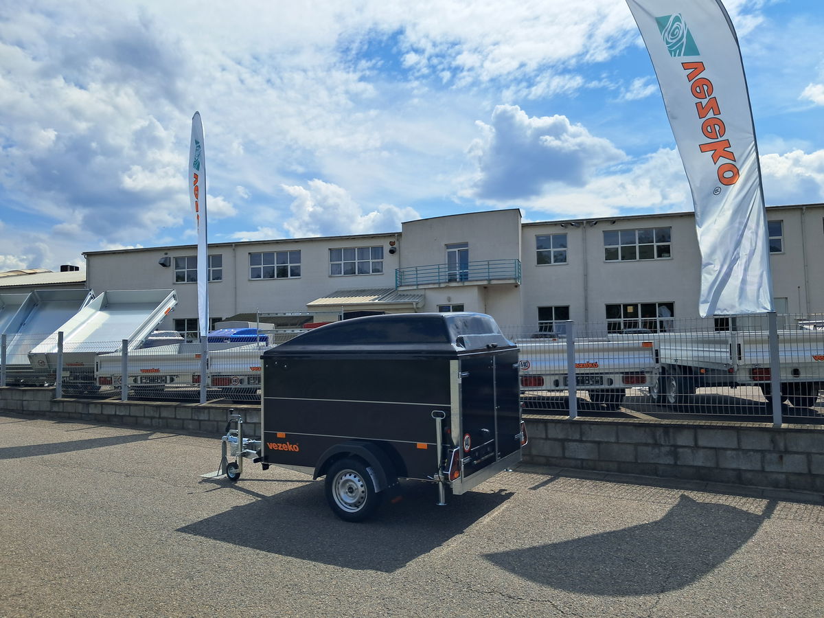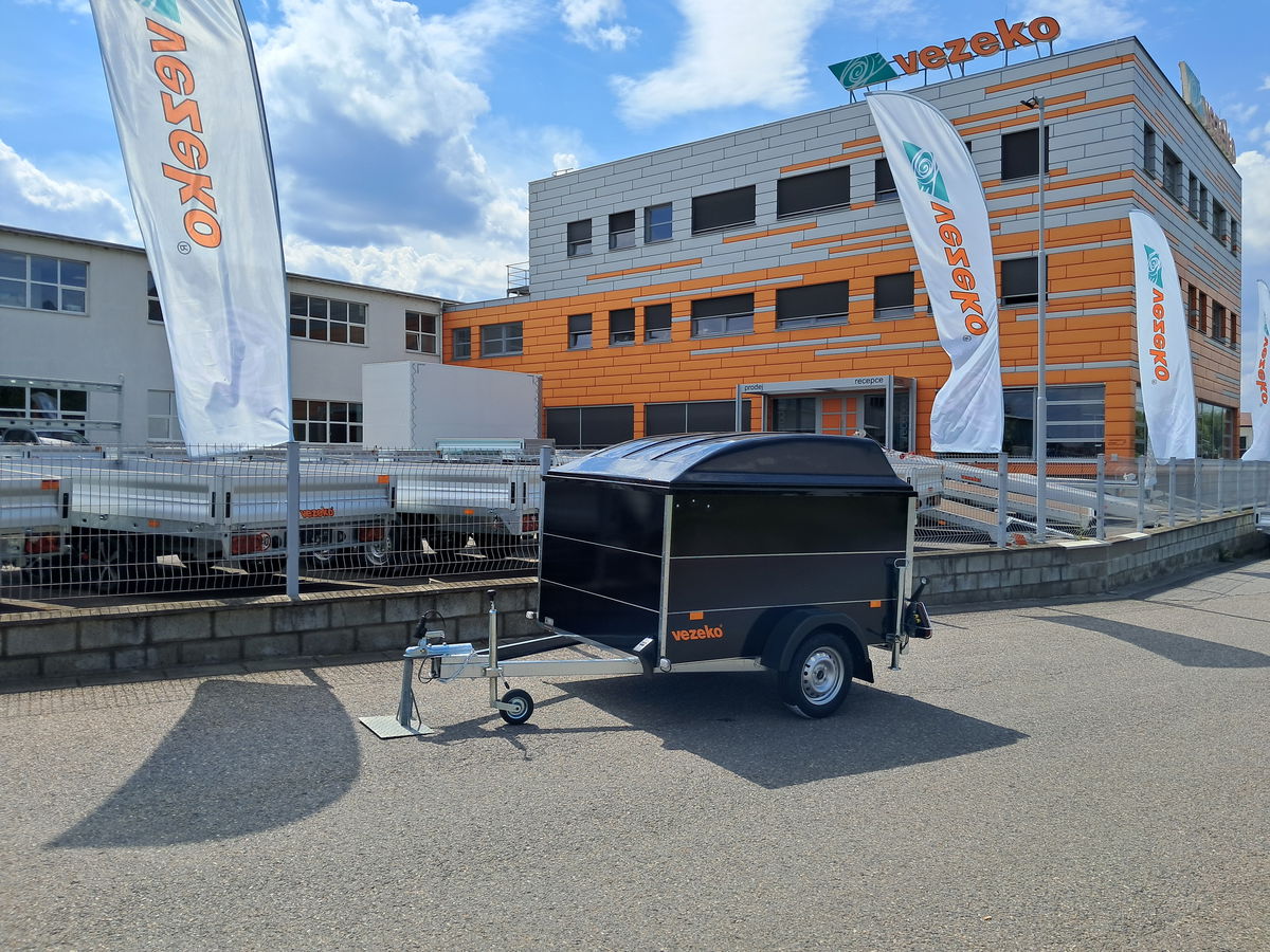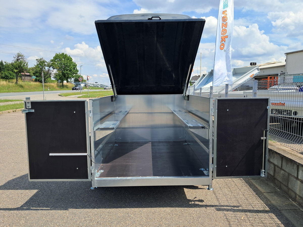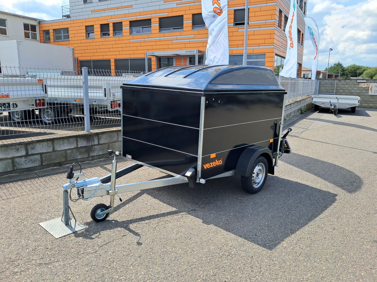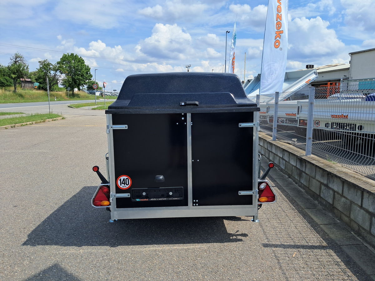 Laminátové víko 300 mm, výklopné, uzamykatelné. Barva víka černá + černý polep přívěsu