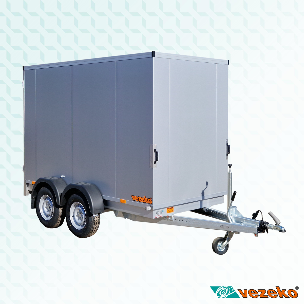 Skříňový přívěs ze sendvičových panelů 30 mm, barva stříbrná ven, bílá dovnitř (případně opačně).