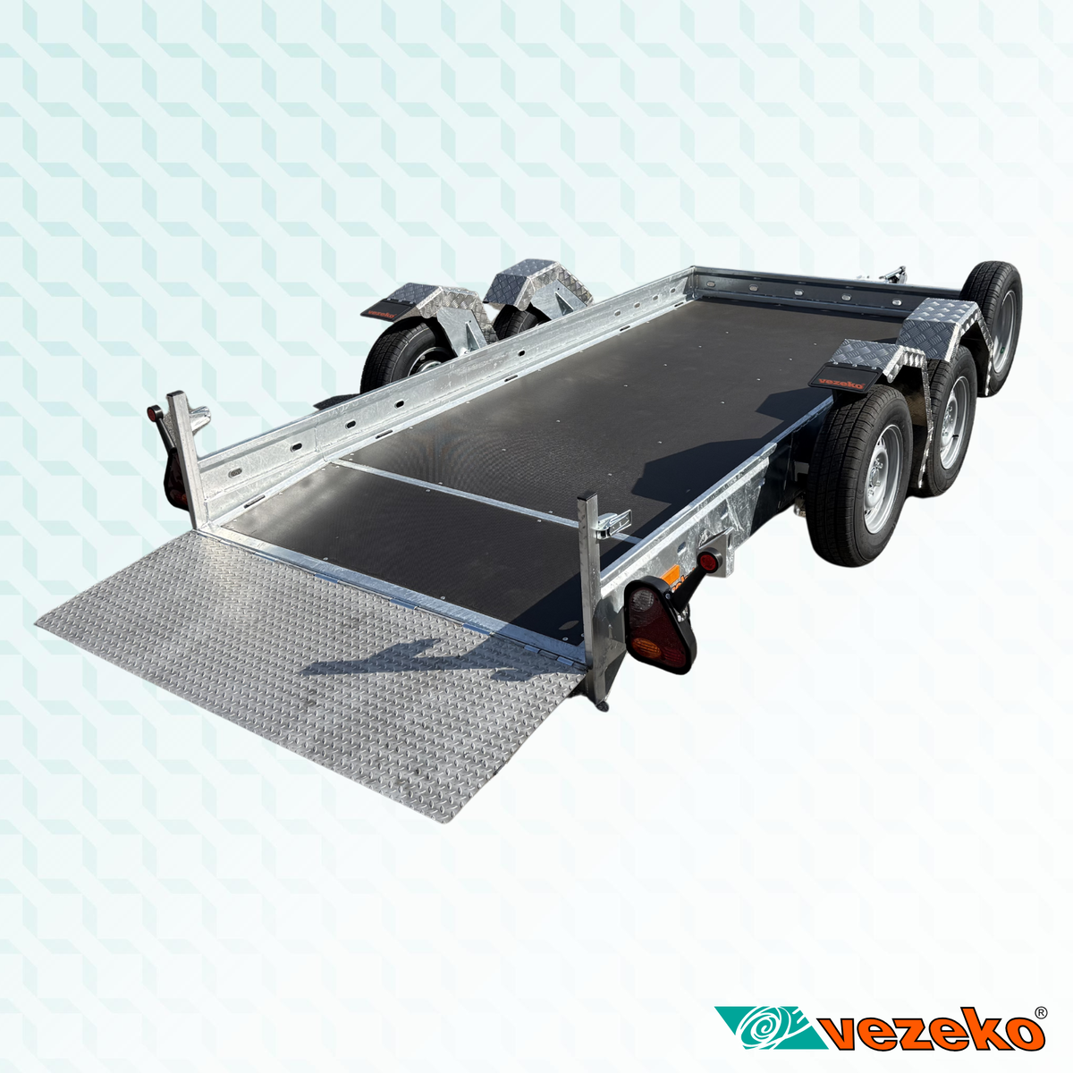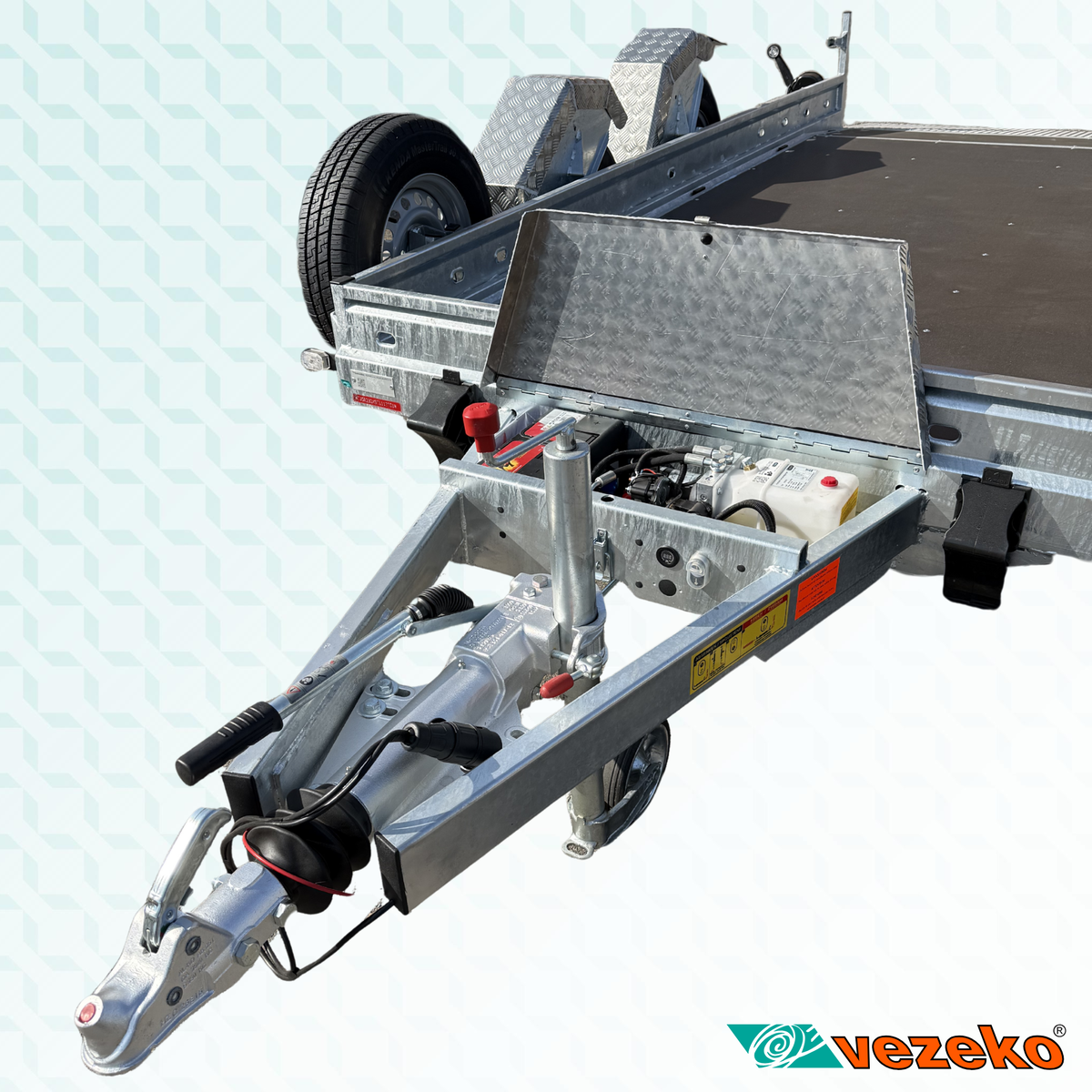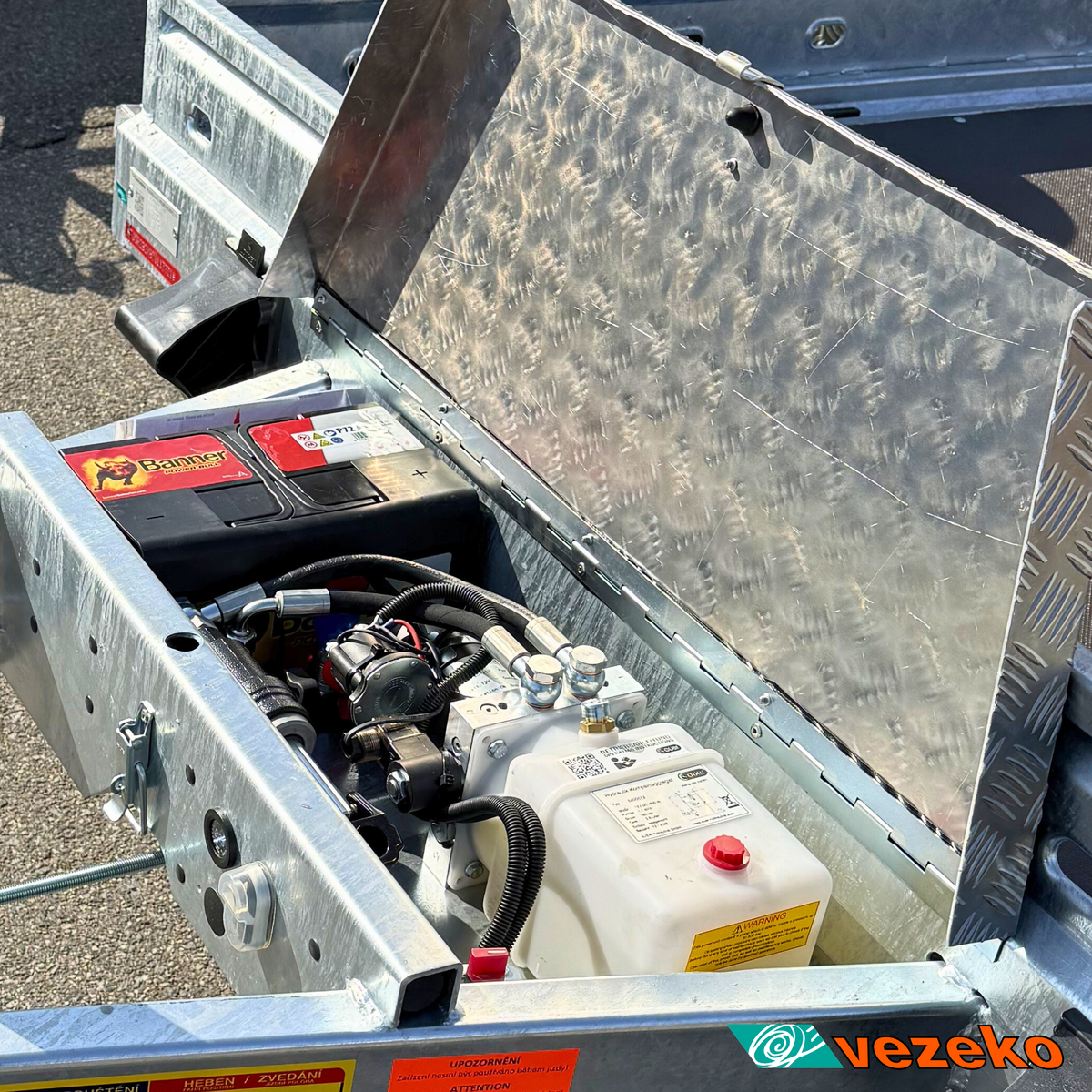 Přívěs je vybaven zesílenou nerezovou rampou, elektrohydraulickou jednotkou pro spouštění ložné plochy a rezervním kolem.