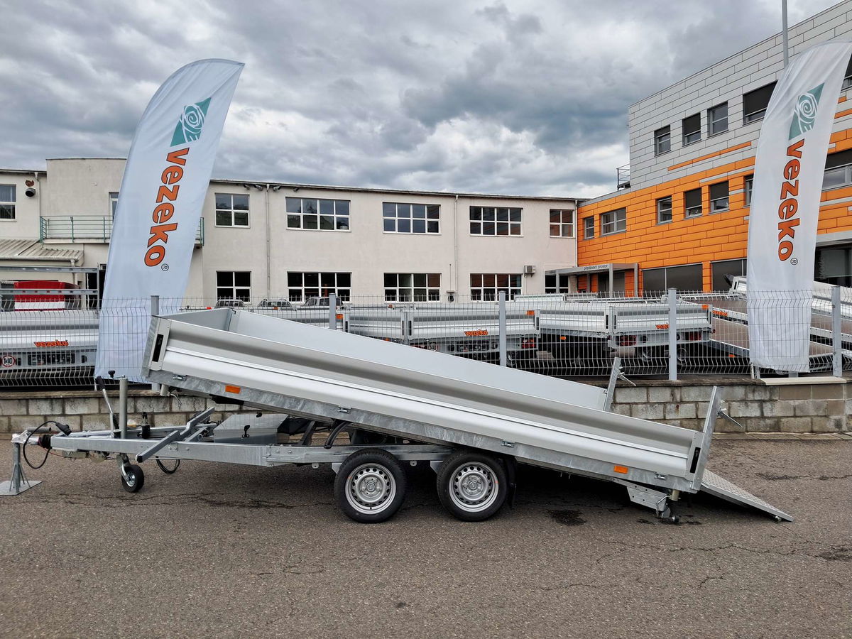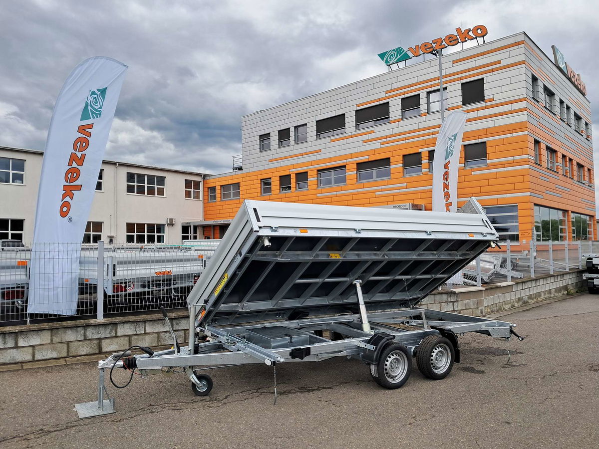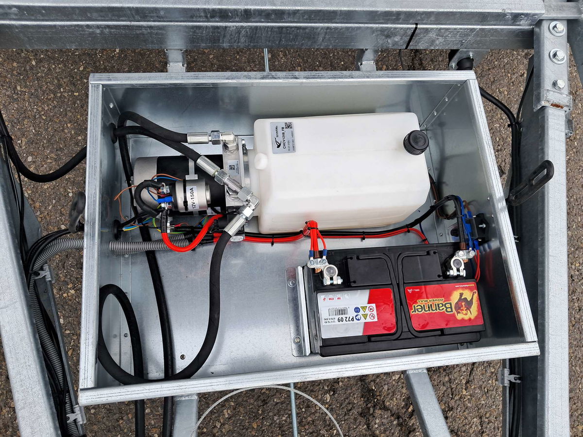 Třístraný sklápěč s druhým rámem pro naklopení ložné plochy s elektrohydraulickým čerpadlem.