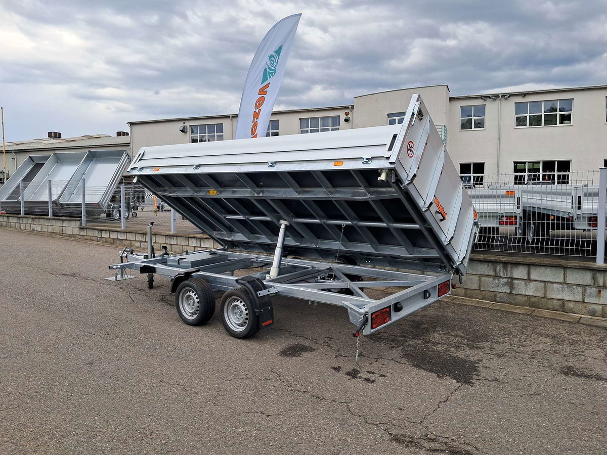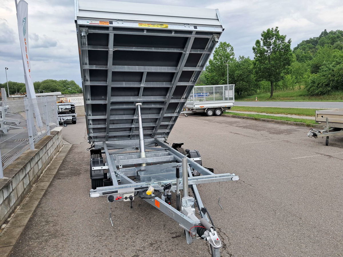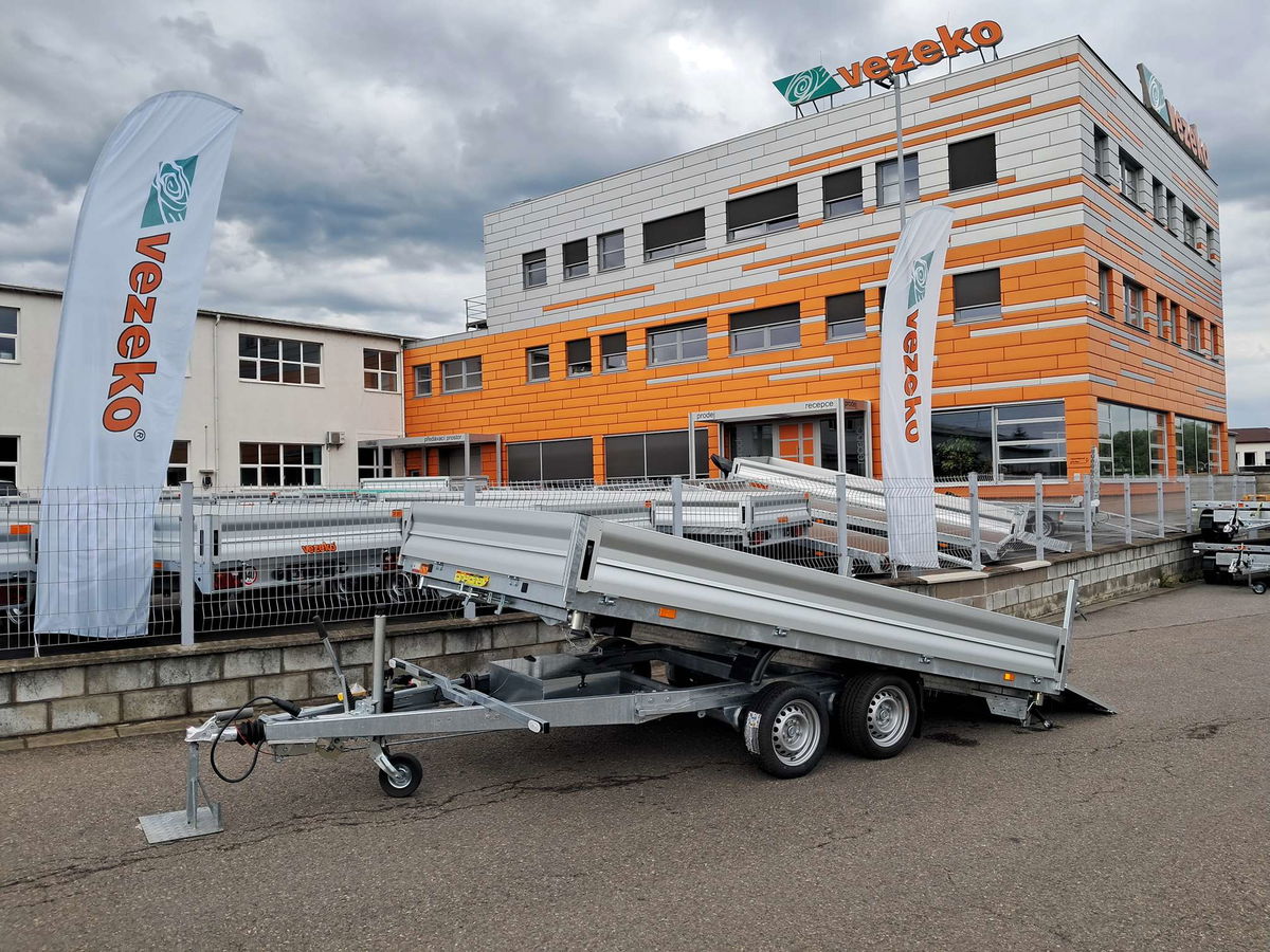 Třístraný sklápěč s druhým rámem pro naklopení ložné plochy s elektrohydraulickým čerpadlem.