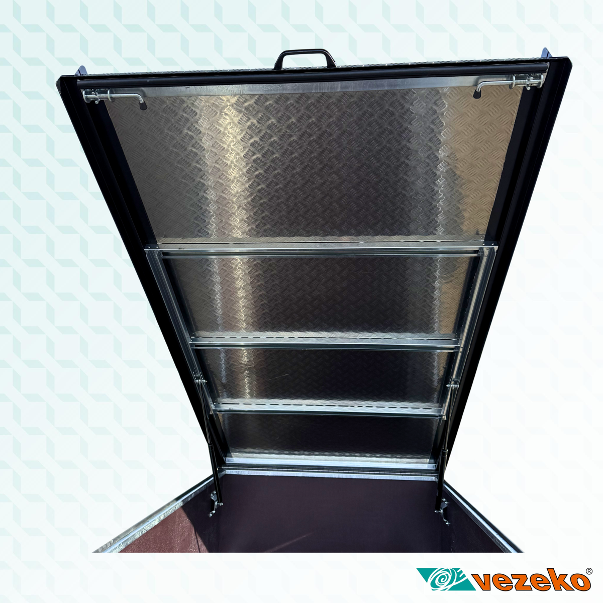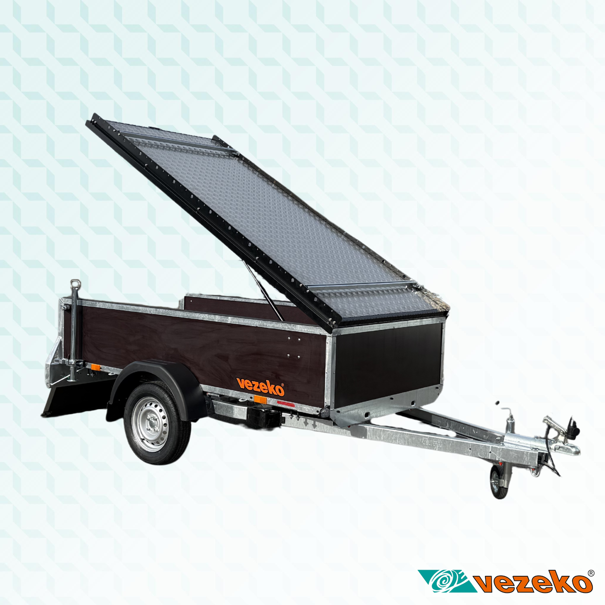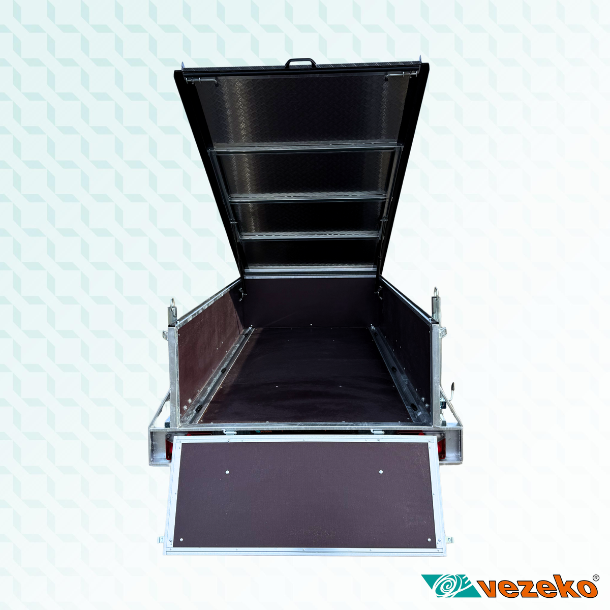 Víko je výklopné pomocí plynových vzpěr. Zajištěné je uvnitř přívěsu. Zadní otevírací čelo je uzamykatelné. Celý vnitřní prostor je tak uzamčený a chráněný proti krádeži.
